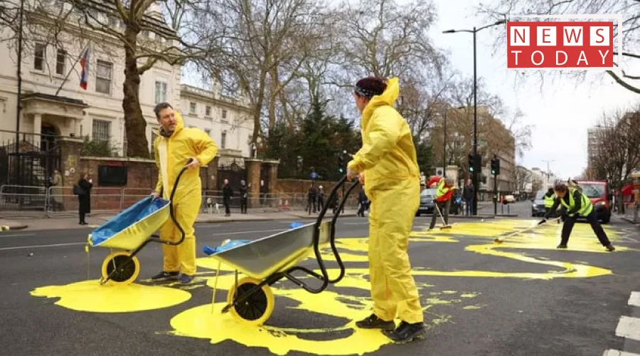 لندن میں یوکرین کا جھنڈا زمین پر پینٹ:
